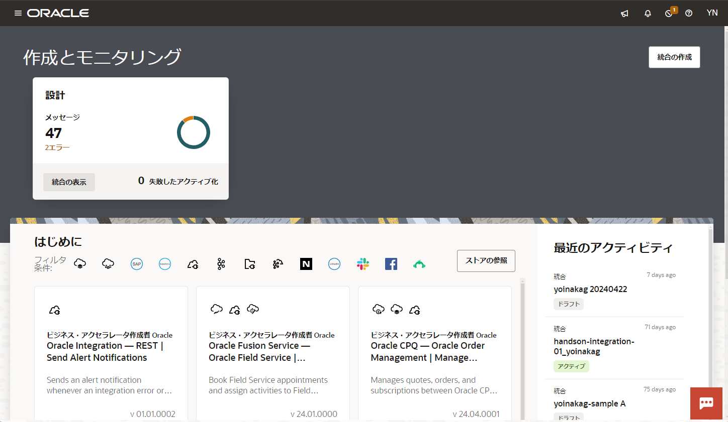 Oracle Integration Cloud の “統合” は、アプリケーションやサービスの間の連携のステップを定義したものです。 このチュートリアルで作成する統合は、次の処理を実行します。