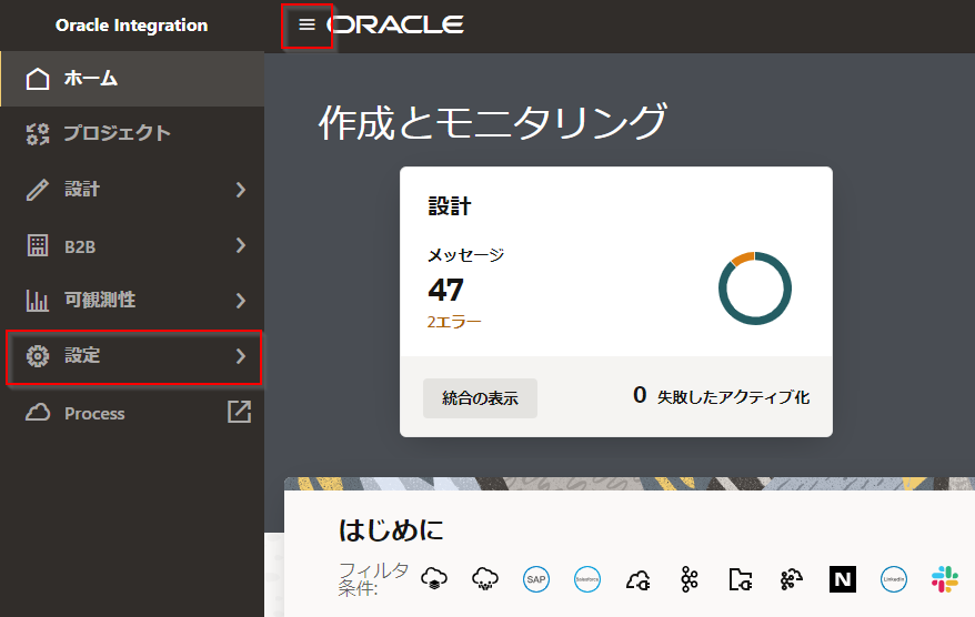 Oracle Integration Cloud のサービス・コンソールにログインします。 画面左上のハンバーガー・メニュー・アイコンをクリックしてナビゲーション・ペインを開きます。