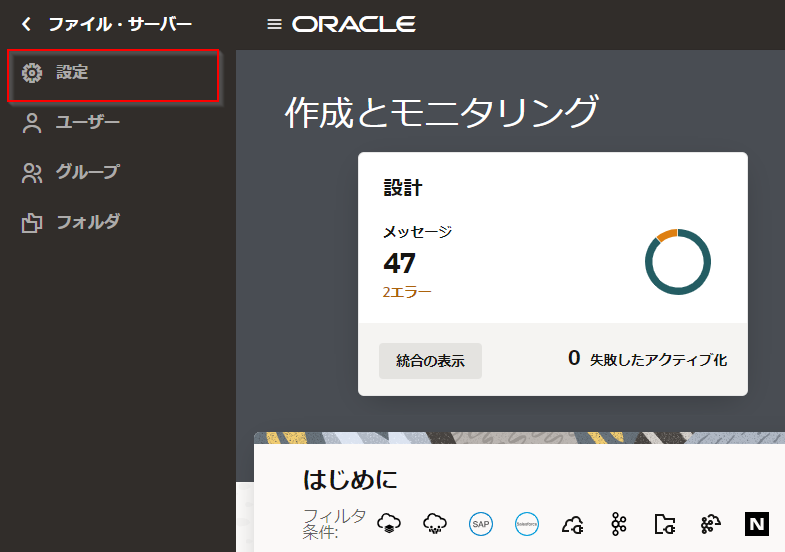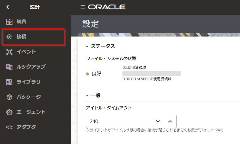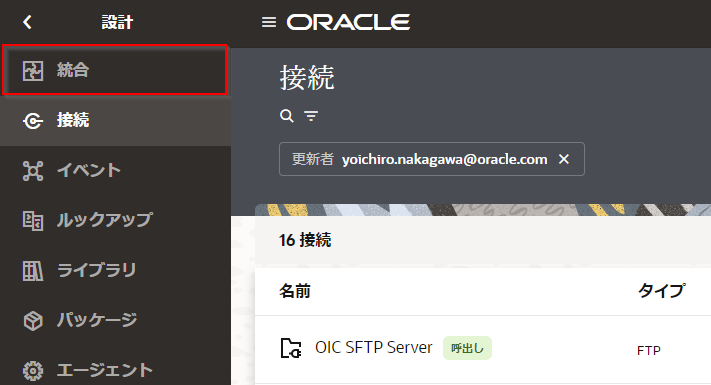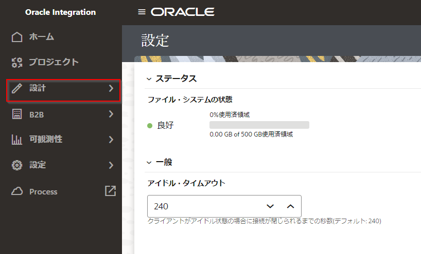 Noteファイル・サーバーの 「設定」 ページを開いている場合は、ナビゲーション・ペインの左上の 「<」 アイコンを2回クリックして、 「Oracle Integration」 メニューを表示させ、 「設計」 をクリックします。