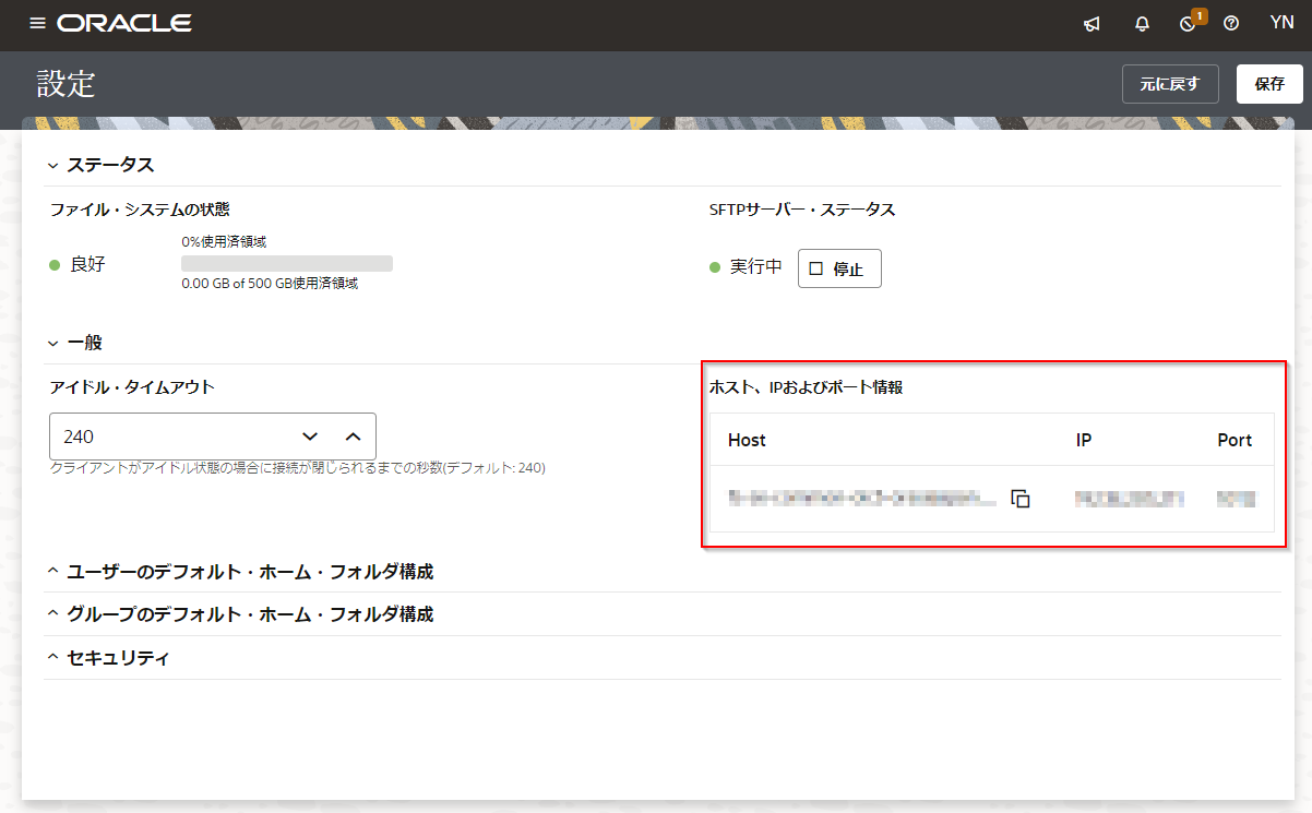 FTP アダプタ接続を作成するためには、FTP サーバーのホスト名または IP アドレスとポート番号が必要です。 Oracle Integration Cloud 組み込みの SFTP サーバーの IP アドレスとポート番号は、次の手順で確認できます。