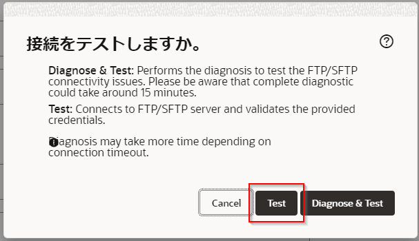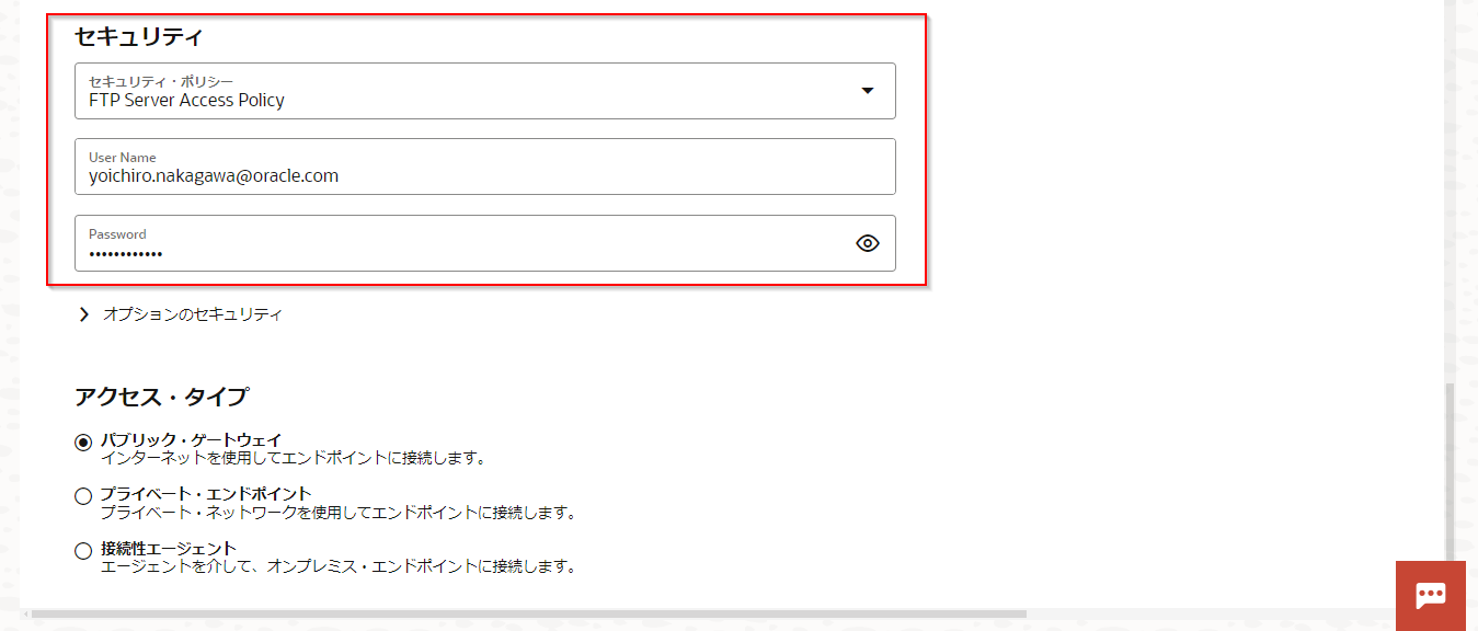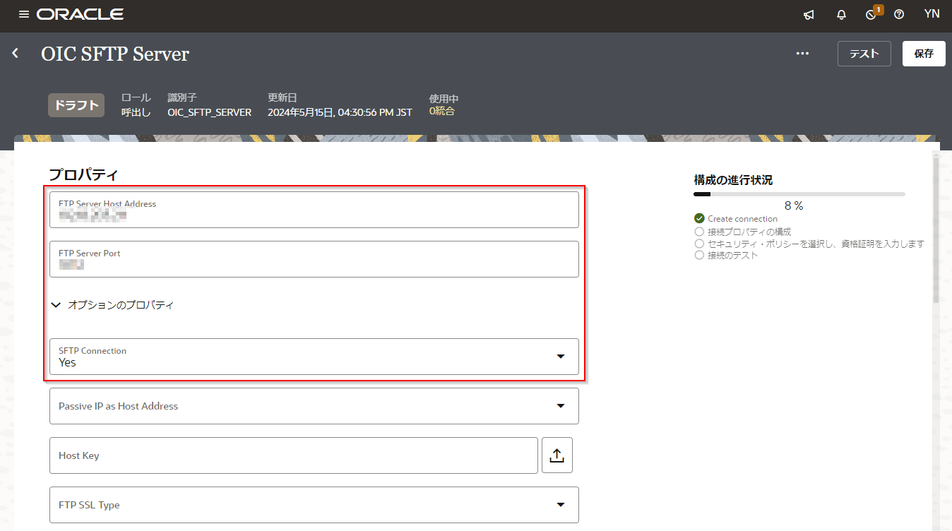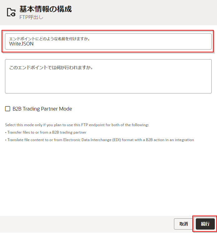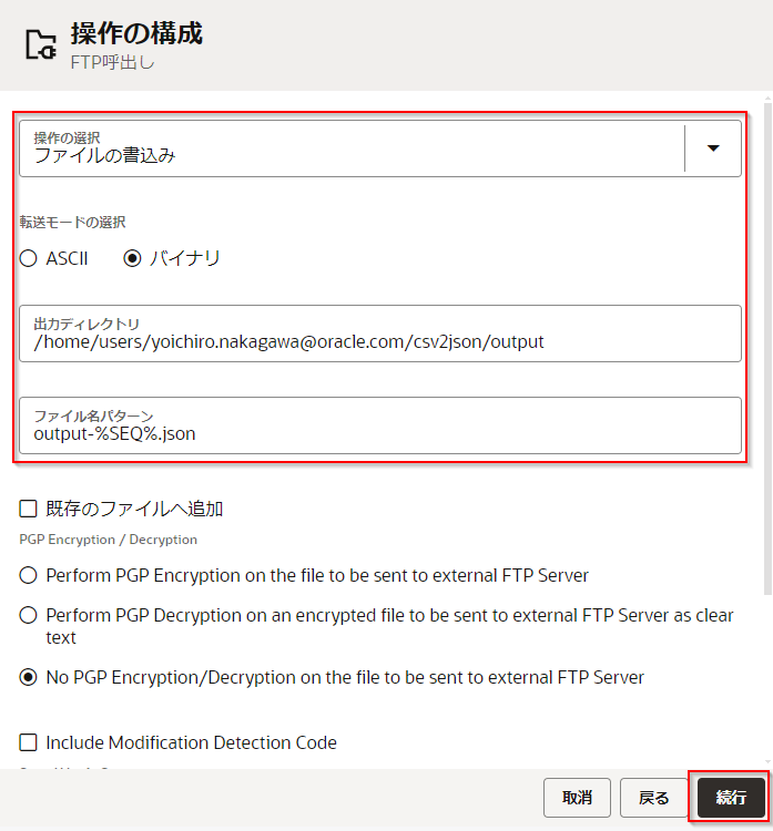 | 「FTPサーバー・ポート」 | Oracle Integration Cloud 埋め込みファイル・サーバーのポート番号を入力 |