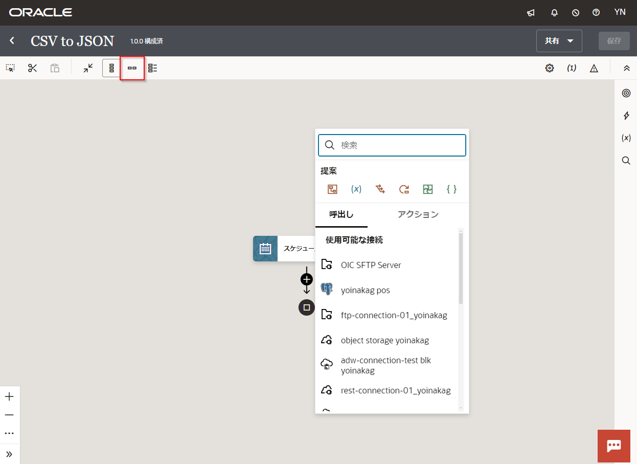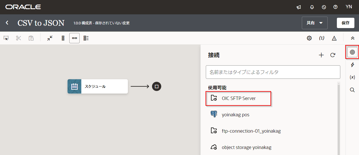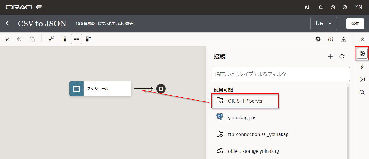 NoteReadCSVを配置した手順と同様に右の呼び出し(◎のアイコン)から「OIC SFTP Server」をドラッグ・アンド・ドロップで配置することも可能です。