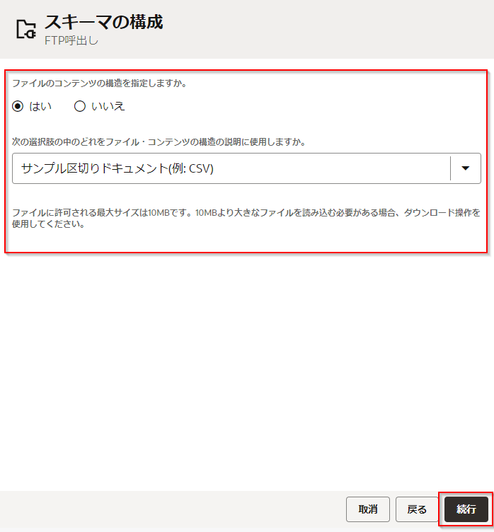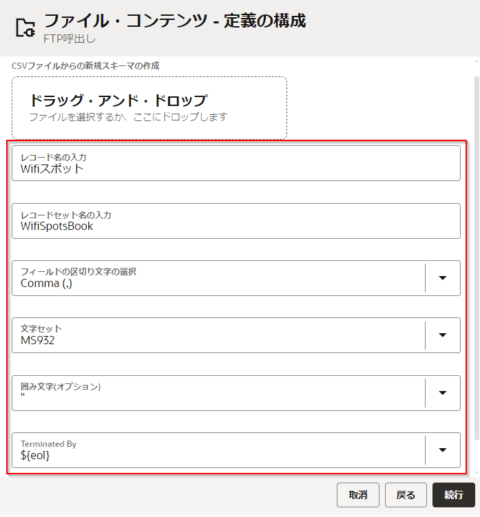 次に「スキーマの構成」 では、読取る CSV ファイルのデータの構造の指定方法を選択します。 次のように入力し、「続行」ボタンをクリックします。