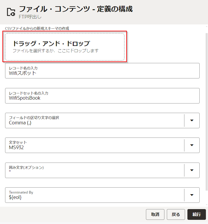 - FTP アダプタ接続を使用して、ファイル・サーバーから CSV ファイルを読取る設定を行う