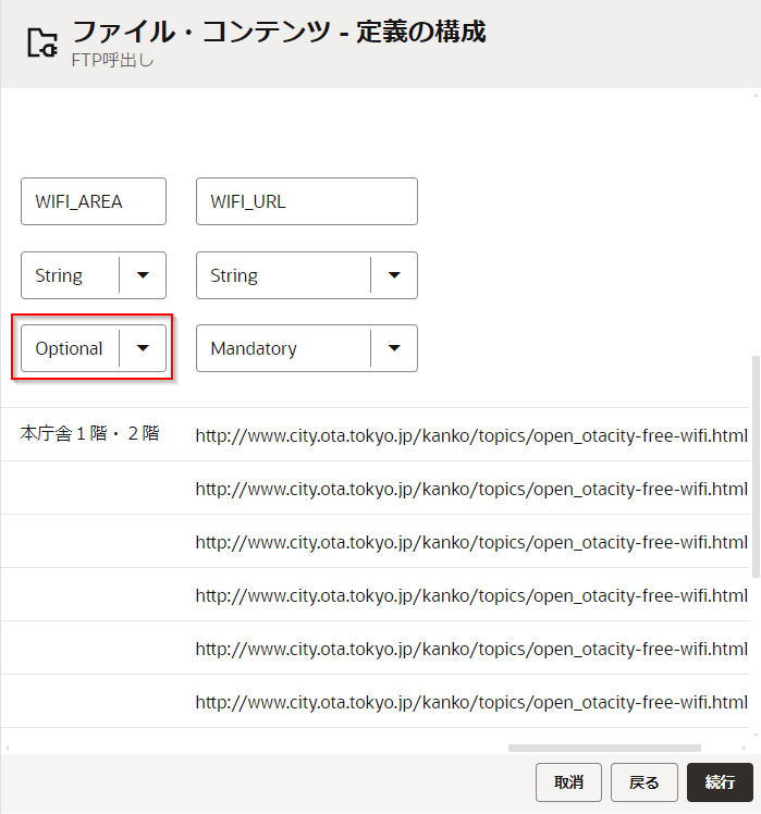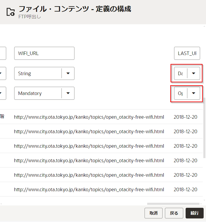 | LAST_UPDATED | ・「String」 を 「Date」 に変更 ・「Mandatory」 を 「Optional」 に変更 |