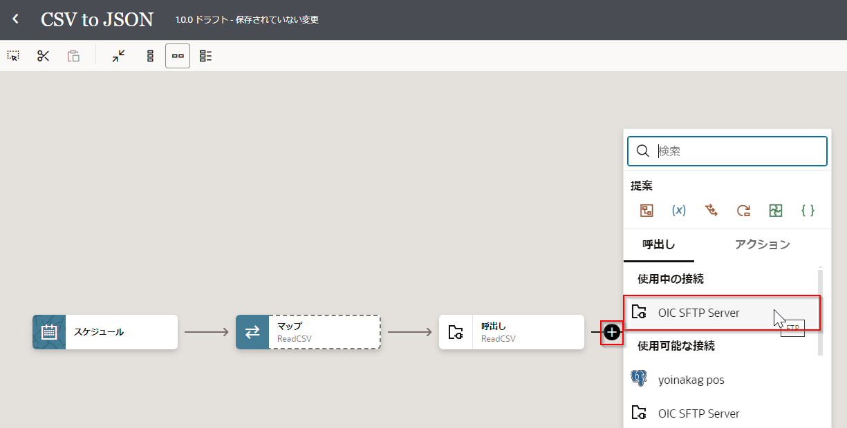 キャンバス・ビューの 「ReadCSV」 アイコンから出る右向きの矢印にカーソルを合わせると「+」マークが出てくるのでクリックして表示されるリストから「OIC SFTP Server」をクリックします。