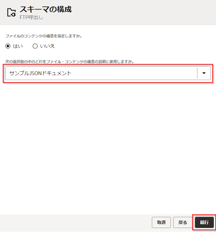 | 「次の選択肢の中のどれをファイル・コンテンツの構造の説明に使用しますか。」 | 「サンプルJSONドキュメント」 を選択 |