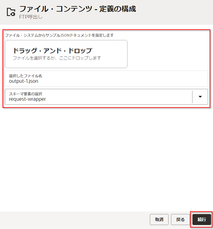 「ファイル・コンテンツ - 定義の構成」 では、書込む JSON ファイルのサンプルをアップロードします。