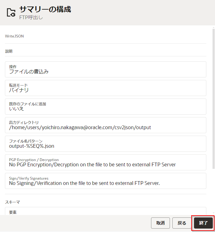 - FTP アダプタ接続を使用して、ファイルサーバーに JSON ファイルを書込む設定を行う