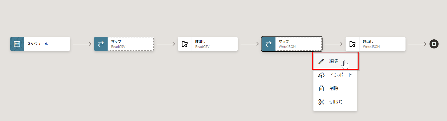 キャンバス・ビューで、 「マップ WriteJSON」 を選択します。 表示される 「編集」 アイコンをクリックします。