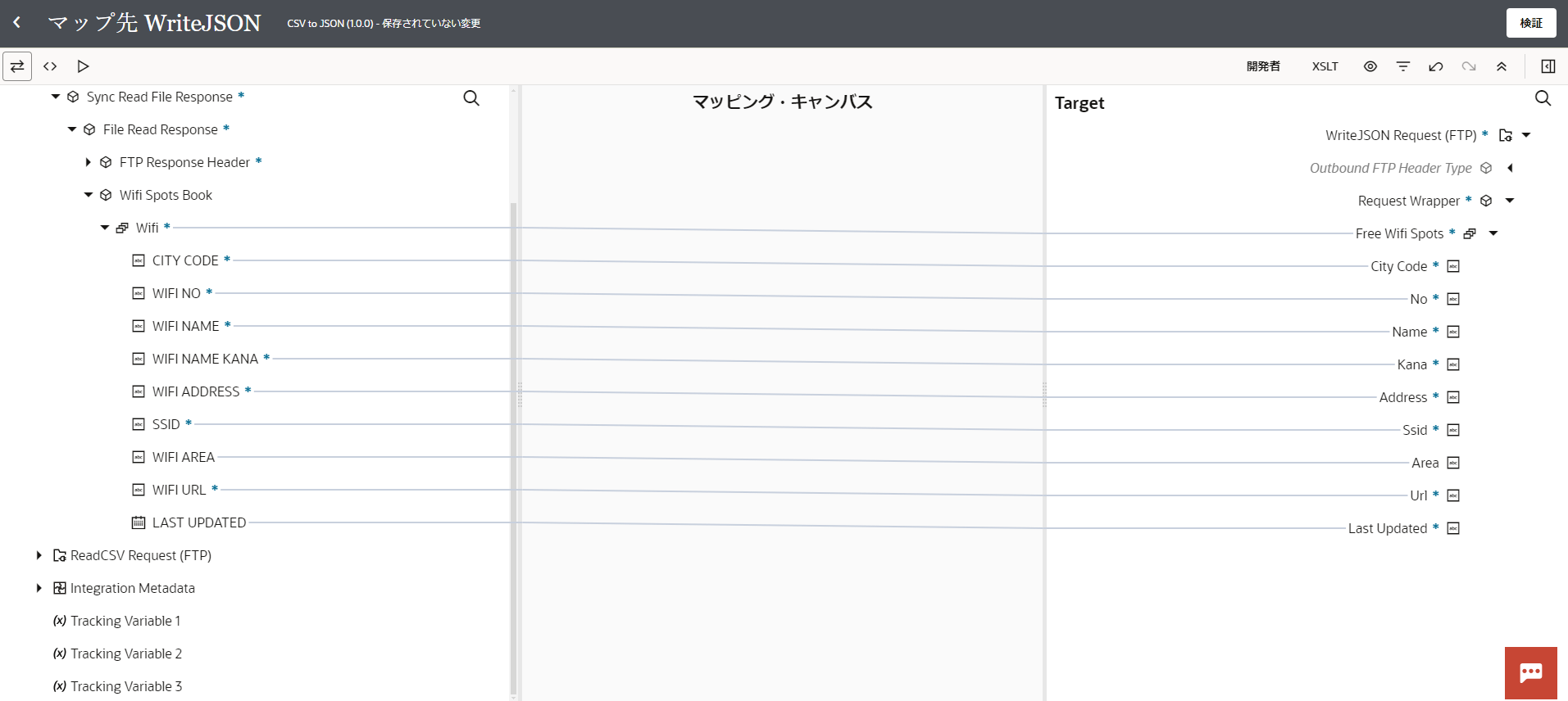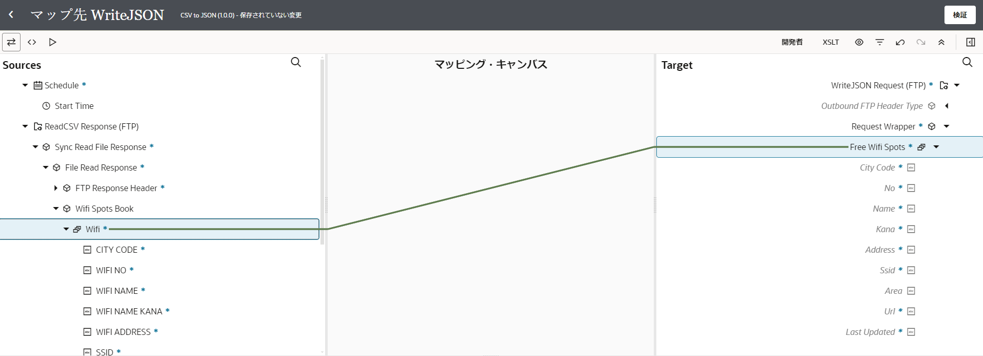 データのマッピングの設定を行うためのマッパーが表示されます。 マッパーの画面左側に表示されている 「Sources」 ペインの 「ReadCSV Response (FTP)」 → 「SyncReadResponse」 → 「FireReadResponse」 → 「WifiSpotsBook」 → 「Wifi」 を、画面右側に表示されている 「Target」 ペインの 「WriteJSON Request (FTP)」 → 「Request Wrapper」 → 「Free Wifi Spots」 にドラッグ&ドロップでマップします。