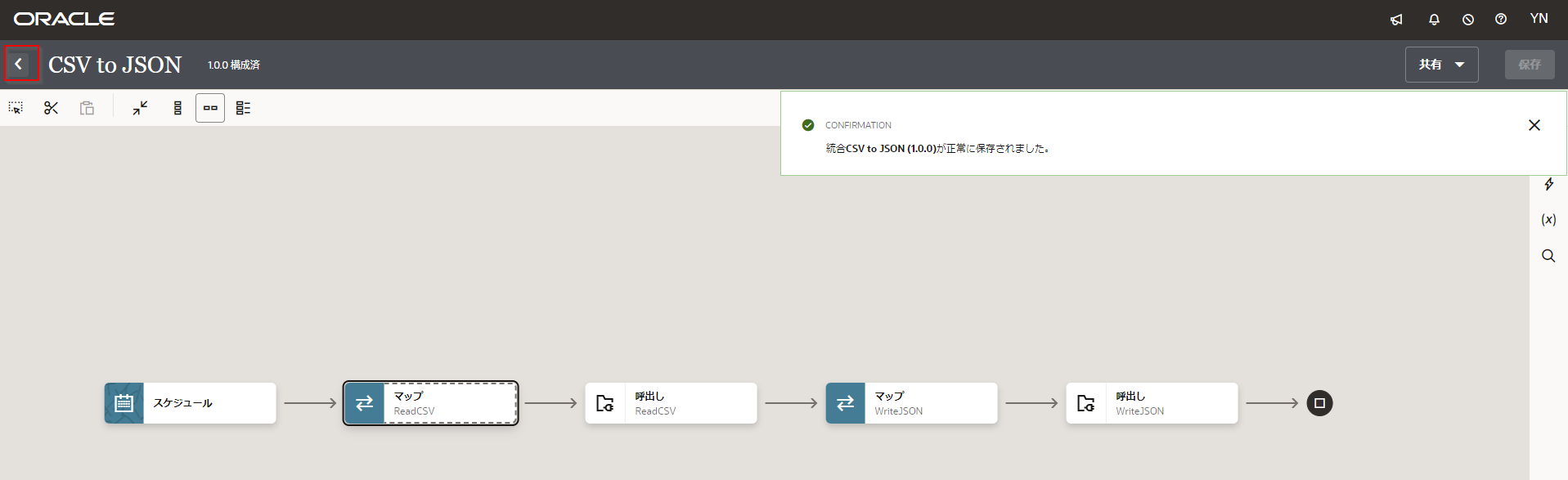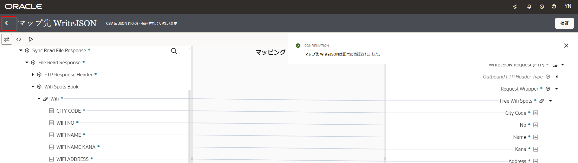 「マップ先 WriteJSONは正常に検証されました。」 というメッセージが表示されたら、 「<」 ボタンをクリックしてへ戻ります。
