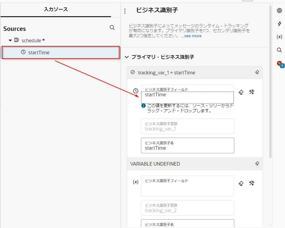 「ビジネス識別子」と「入力ソース」 ボックスが表示されます。 左側の「入力ボックス」のSourcesツリーから 「schedule」 の下の 「startTime」 を、ボックスの右側に表示されているテーブルの 「ビジネス識別子フィールド」 列の1行目にドラッグ&ドロップします。