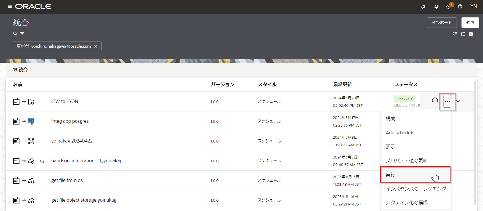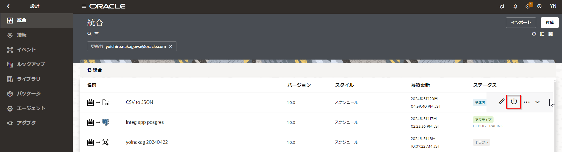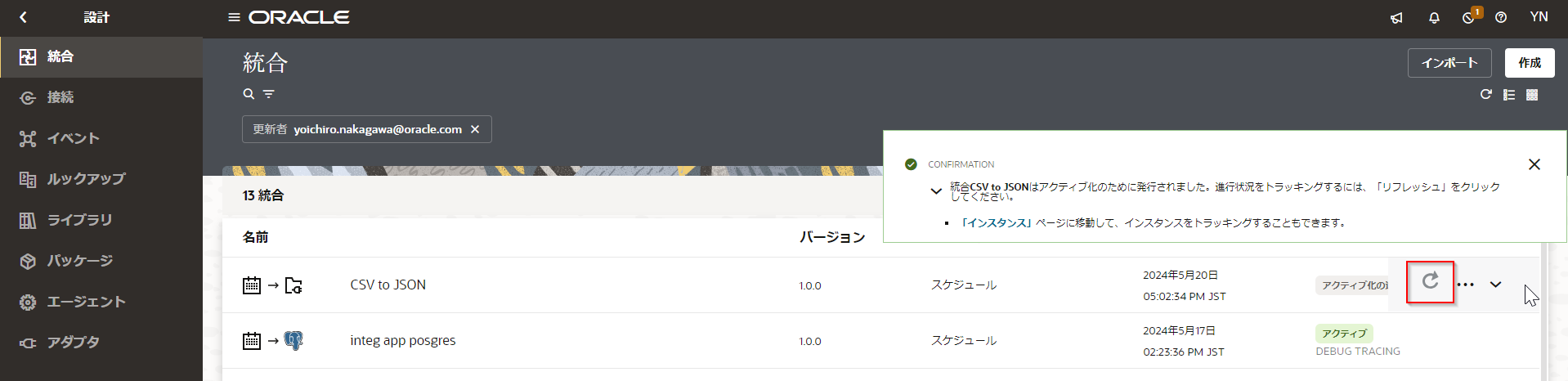 Oracle Integration Cloud で作成した統合を実行するには、アクティブ化します。 実行する統合にマウス・ポインタを合わせ、表示された 「アクティブ化」 アイコンをクリックします。