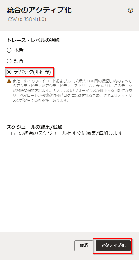 「統合のアクティブ化」 ボックスが表示されます。 「トレース・レベルの選択」を「デバッグ(非推奨)」にチェックし、右下に表示されている 「アクティブ化」 ボタンをクリックします。