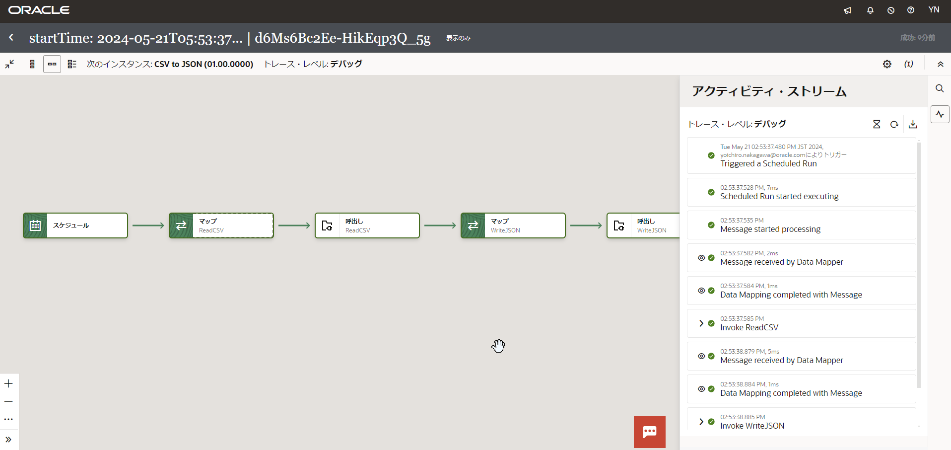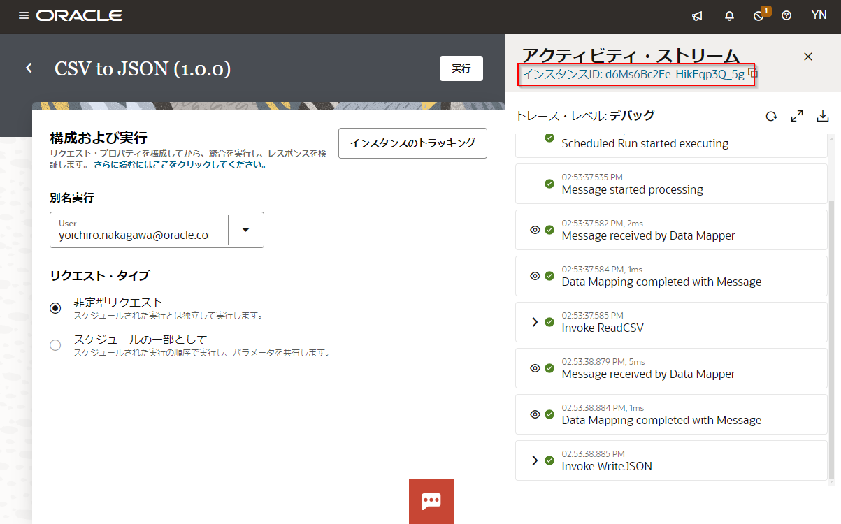 実行するとそのまま右側に「アクティビティ・ストリーム」というボックスが表示されリアルタイムで実行結果が確認できます。アクティビティ・ストリーム内の「👁」のマークを押すと実行された処理の詳細が確認できます。