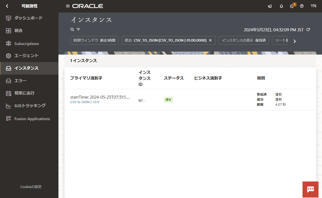 視覚的に統合処理がどこまで進んでいるか確認するためにはトラッキングの画面に遷移します。ボックス上部に表示されている「インスタンスID」のリンクをクリックします。