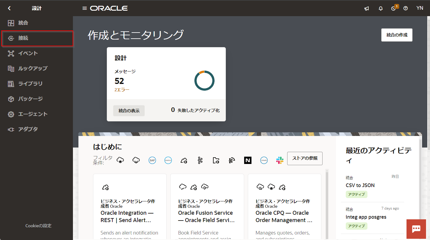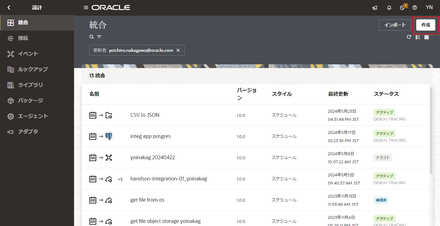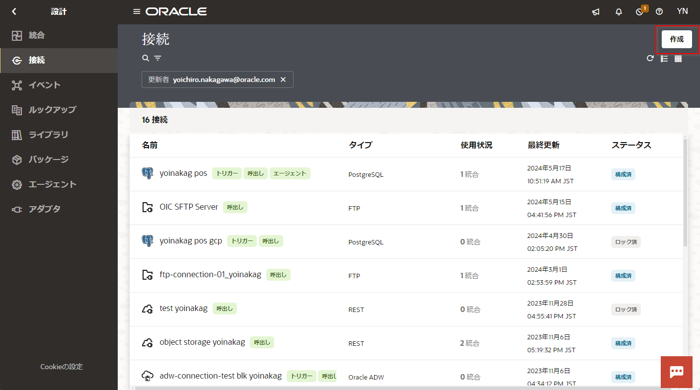 Oralce Integration Cloud にログインし、 「接続」 ページを開きます。 「接続」 ページの右上にある 「作成」 ボタンをクリックします。