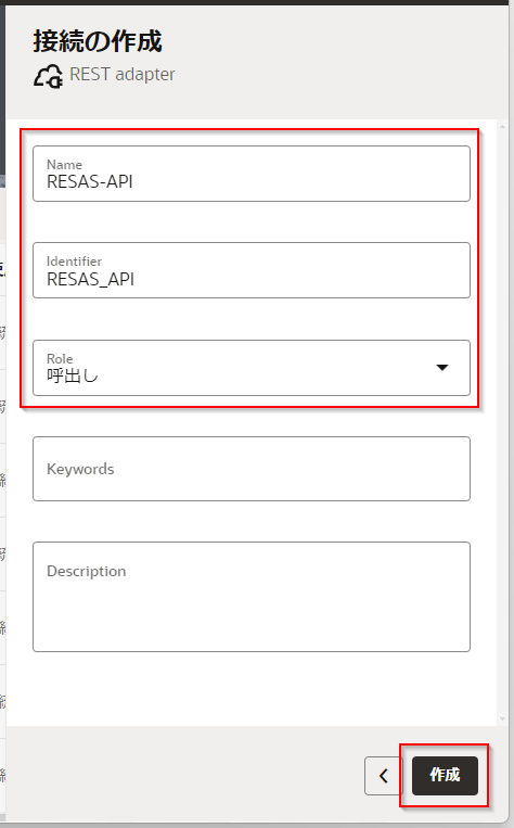 入力したら右下の 「作成」 ボタンをクリックします。入力項目 入力する値 「名前」 RESAS-API「識別子」 RESAS-API(「名前」を入力すると自動的に設定されます)「ロール」 「呼び出し」 を選択