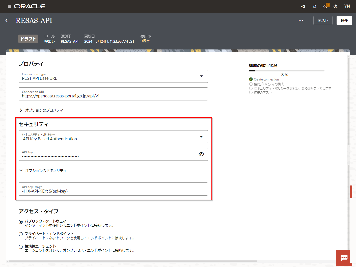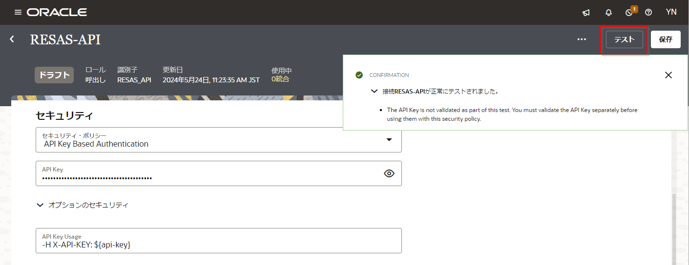 入力項目 入力する値 「セキュリティ・ポリシー」 「API Key Based Authentication」 を選択 「APIキー」 RESAS-API から発行された API キーを入力 「APIキーの用途」 -H X-API-KEY: ${api-key}