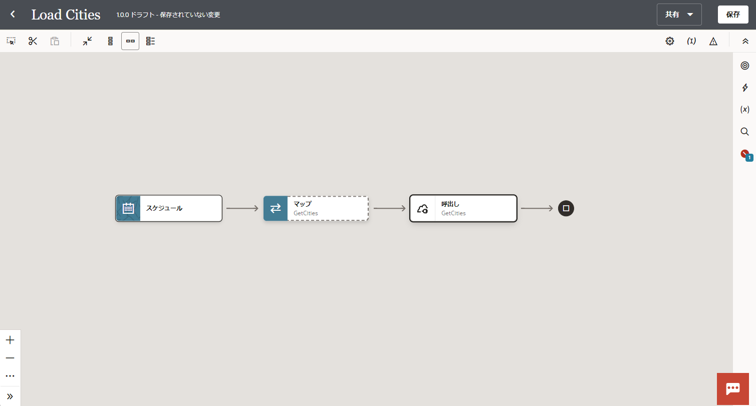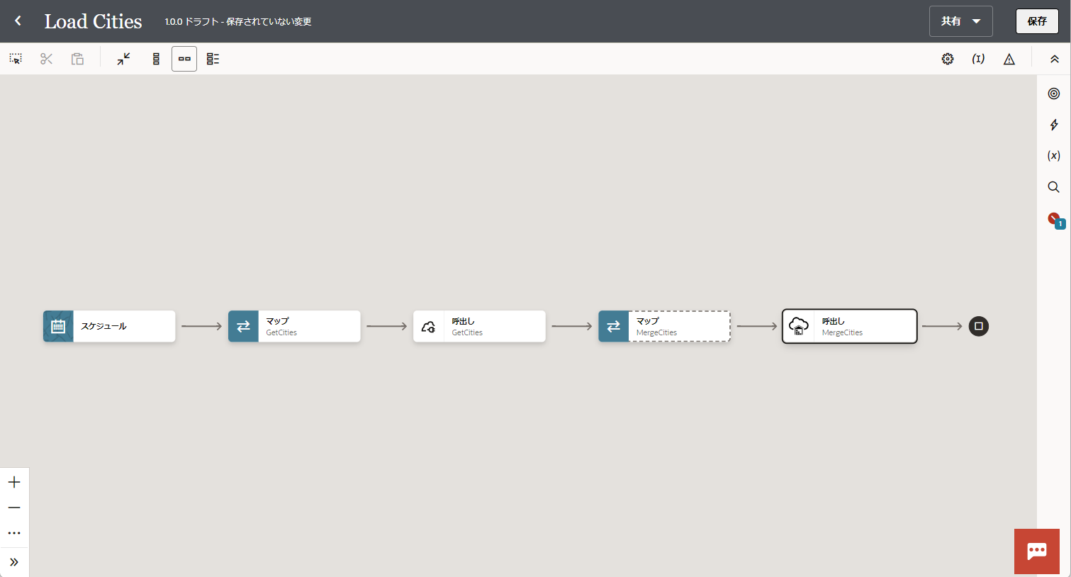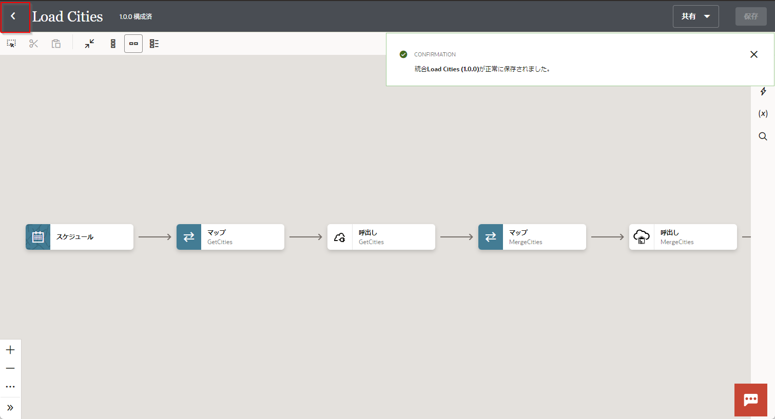 これで、RESAS-API の市区町村一覧のデータを Oracle ADW に保存するための設定が終わりました。 ここまでの設定を保存するために、ページの右上に表示される 「保存」 ボタンをクリックします。