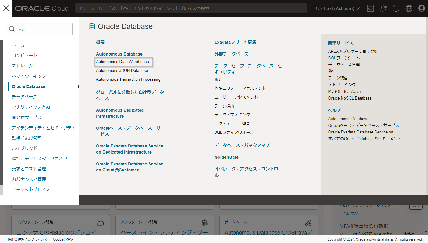 OCI コンソールにログインします。 ページの左側にあるナビゲーション・メニューから 「データベース」 セクションの 「Autonomous Data Warehouse」 を選択します。