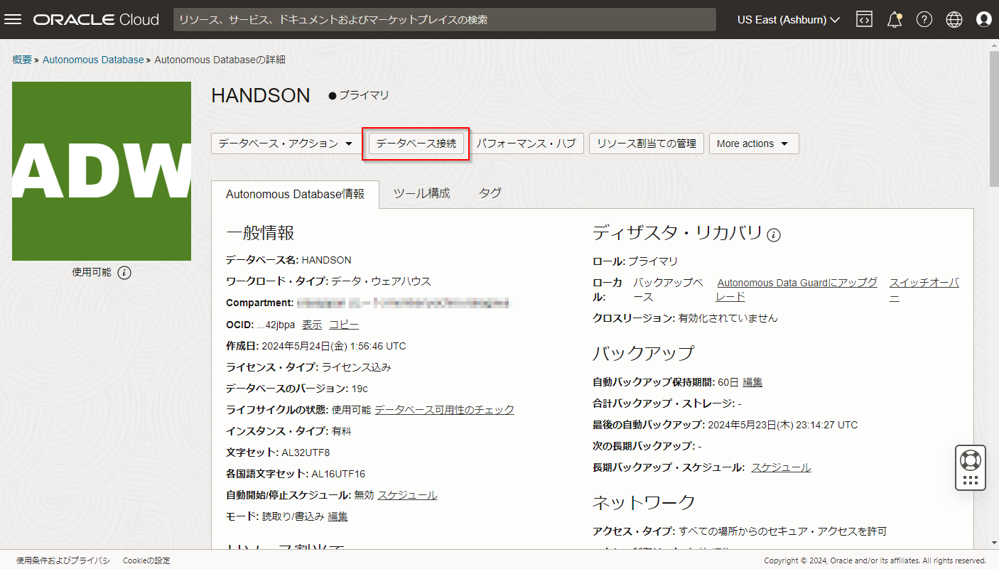 使用する ADW インスタンスが作成された 「リージョン」 と 「コンパートメント」 を選択します。 使用する ADW インスタンスの表示名をクリックして詳細ページを開きます。 「データベース接続」 ボタンをクリックします。