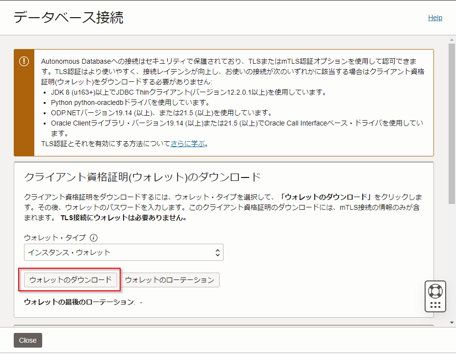 「データベース接続」 ボックスが表示されます。 「ウォレット・タイプ」 では 「インスタンス・ウォレット」 を選択して、 「ウォレットのダウンロード」 ボタンをクリックします。