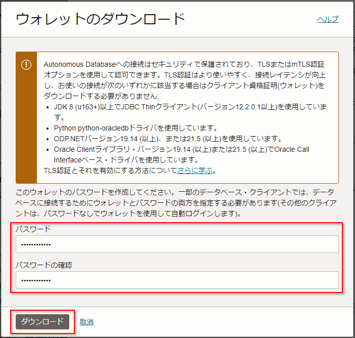 「ウォレットのダウンロード」 ボックスが表示されます。 ウォレットのパスワードを指定する必要があります。 「パスワード」 と 「パスワードの確認」 にパスワードを指定します。 ここで指定したパスワードは、 Oracle Integration Cloud で接続を作成する際に必要なので、忘れないようにしてください。