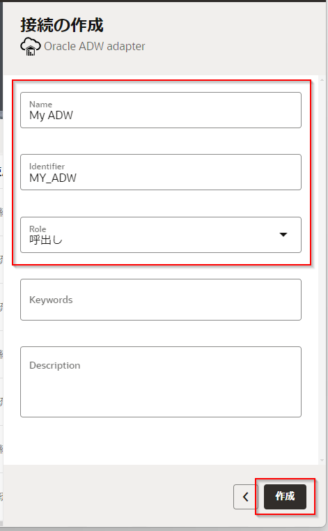 入力項目 入力する値 「名前」 My ADW 「識別子」 MY_ADW 「ロール」 「呼び出し」 を選択