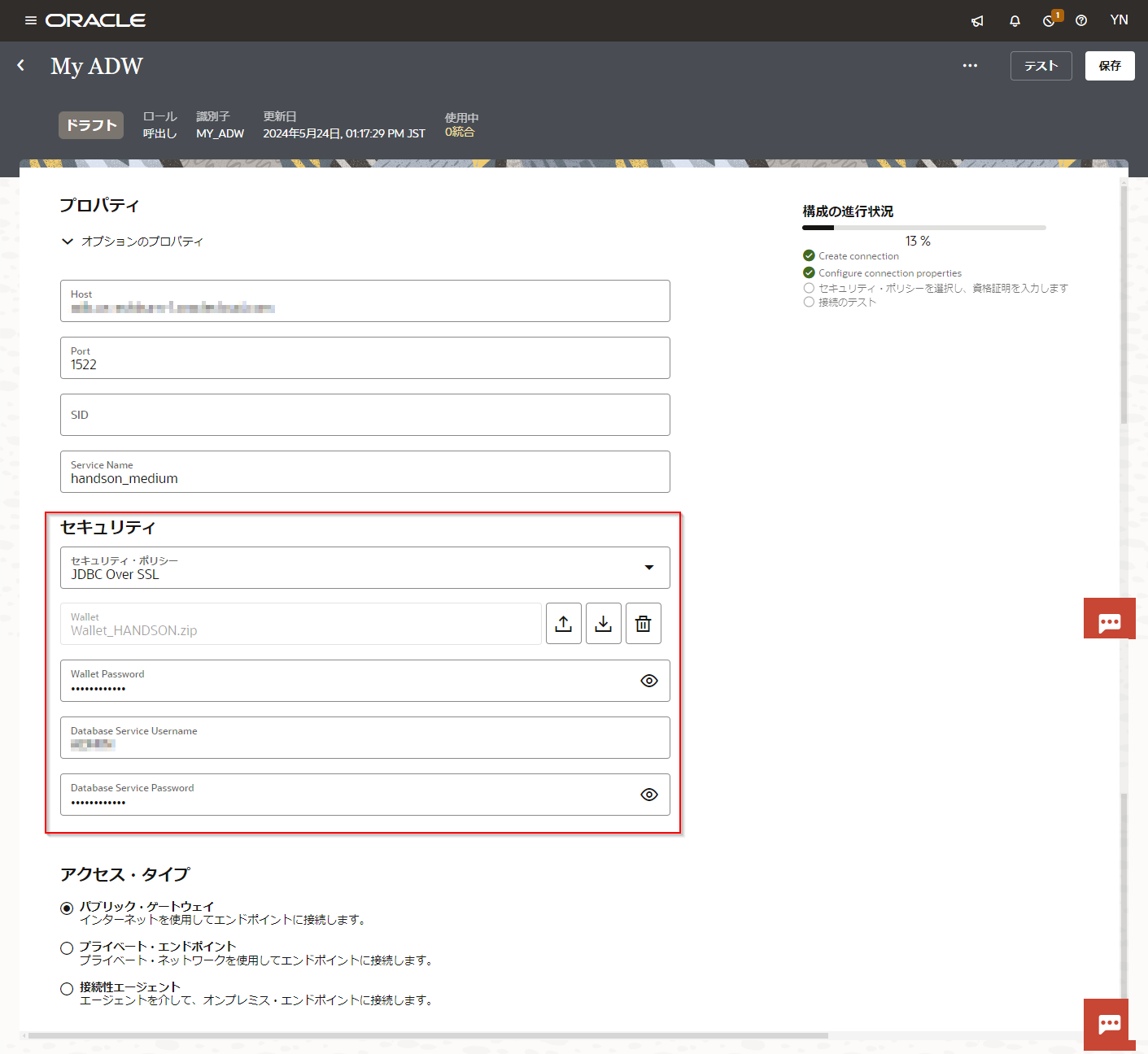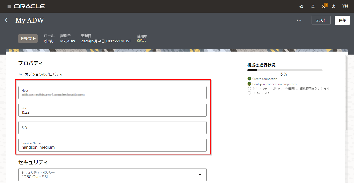 入力項目 入力する値 「セキュリティ・ポリシー」 「JDBC Over SSL」 を選択 「ウォレット」 アップロードボタンをクリックして、ウォレット・ファイル Wallet_<DB名>.zipをアップロード「ウォレット・パスワード」 ウォレット・ファイルをダウンロードする際に指定したパスワードを入力 「データベース・サービス・ユーザー名」 ADW インスタンスのユーザー名を入力 「パスワード」 ADW インスタンスのユーザーのパスワードを入力
