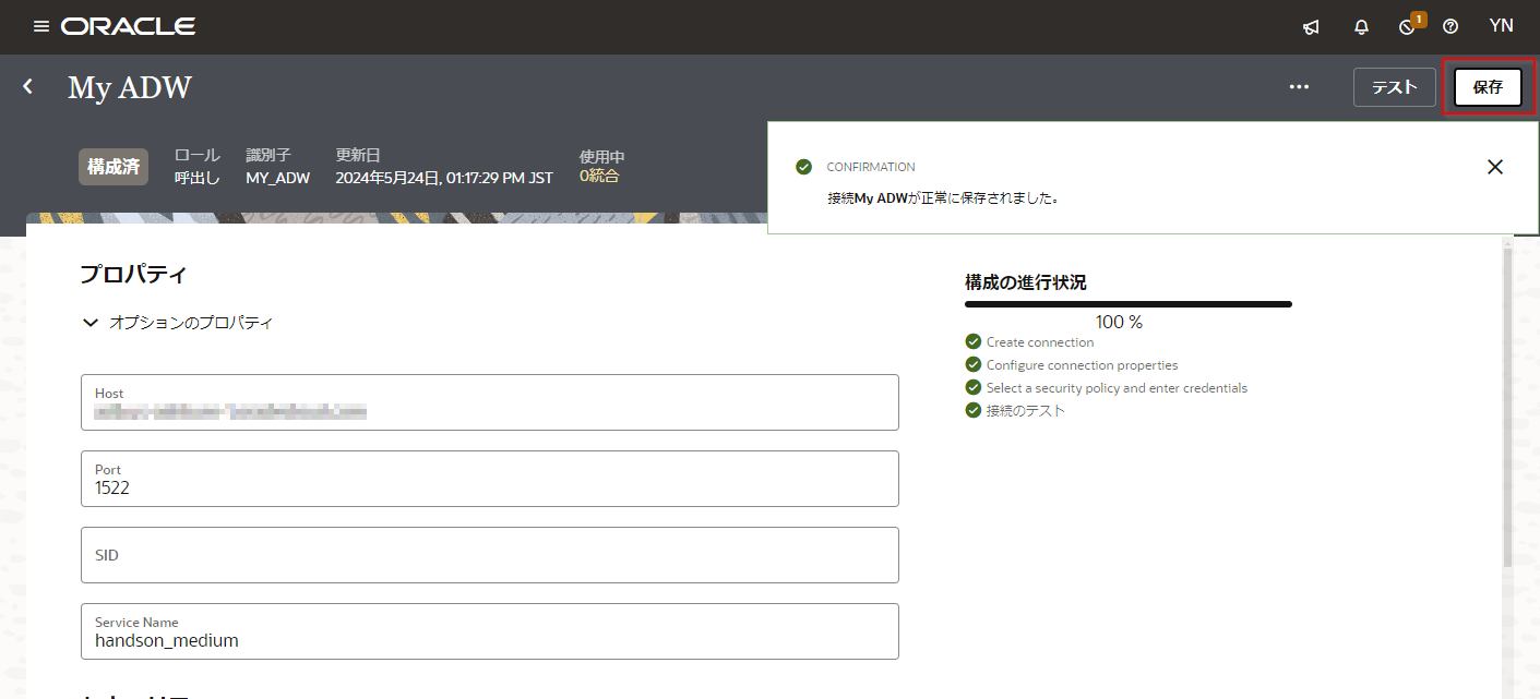 「接続プロパティ」 で指定した値が正しければ、ページの右上に成功したことを表すメッセージ 「接続 XXX が正常にテストされました。」 が表示されます。