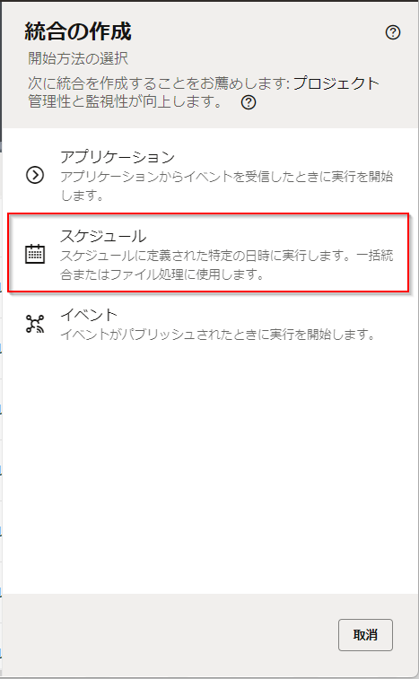 「統合の作成」 ボックスが表示されます。 「開始方法の選択」 では 「スケジュール」 をクリックします。