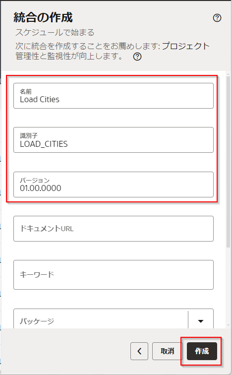 入力項目 入力する値 「名前」 Load Cities「識別子」 LOAD_CITIES(Load Cities と名前をつけると自動的に設定される)「バージョン」 01.00.0000(初期状態で入力されている値をそのまま使用)「ドキュメントURL」 入力しない 「キーワード」 入力しない 「パッケージ」 入力しない 「説明」 入力しない