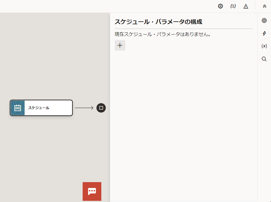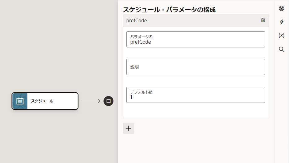 「スケジュール・パラメータの構成」 ブロックが表示されます。ここでは統合処理を実行する際に渡す変数を定義します。今回はRESAS APIに渡す都道府県コード(PREF_CODE)を作成します。 「+」 アイコンをクリックします。