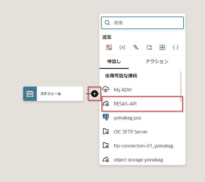 クリックするとロールが呼び出しに設定されている接続のリストが表示されるので、『RESAS-API 呼び出すための REST アダプタを使用した接続』で作成した接続 「RESAS-API」 をクリックします。