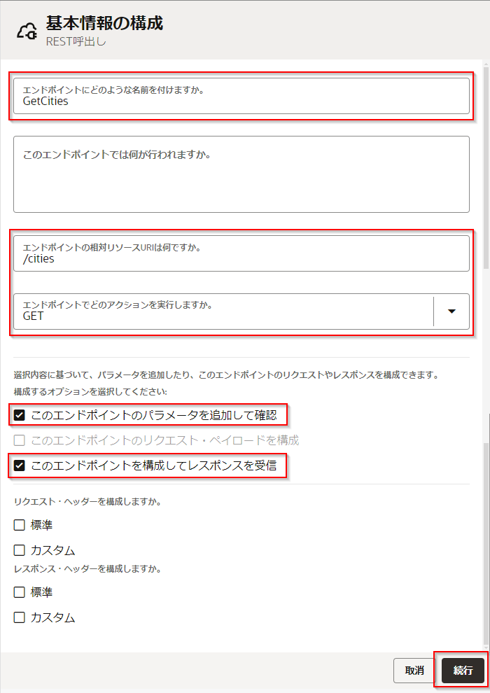 入力項目 入力する値 「エンドポイントにどのような名前をつけますか。」 GetCities「エンドポイントの相対リソースURIは何ですか。」 /cities「エンドポイントでどのアクションを実行しますか。」 「GET」 を選択 「このエンドポイントのパラメータを追加して確認」 チェックする 「このエンドポイントを構成してレスポンスを受信」 チェックする