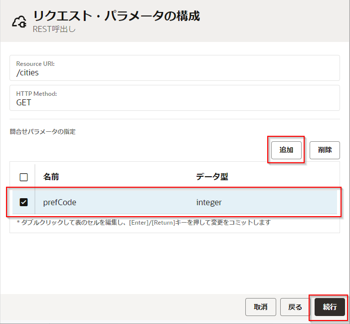 入力し終わったら、「続行」 ボタンをクリックします。入力項目 入力する値 「名前」 prefCode「データ型」 「integer」 を選択