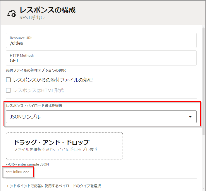 「レスポンスの構成」 では、 REST-API から返ってくるレスポンスの形式を指定します。 「レスポンス・ペイロード」 で 「JSONサンプル」 を選択してから、 「<<< inline >>>」 リンクをクリックします。