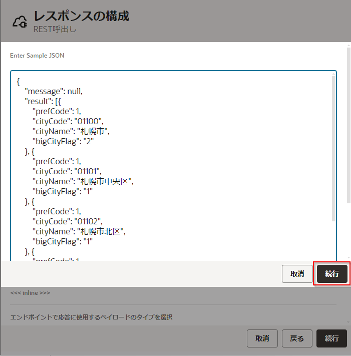 「Enter Sample JSON」 に、RESAS-API の市区町村一覧が返すレスポンスのサンプルを入力します。 RESAS-API の市区町村一覧のドキュメント の 「sample」 セクションの JSON のコードブロックか、次のコードブロックをコピーして、「Enter Sample JSON」 のテキストエリアに、ペーストします。 「続行」 ボタンをクリックします。