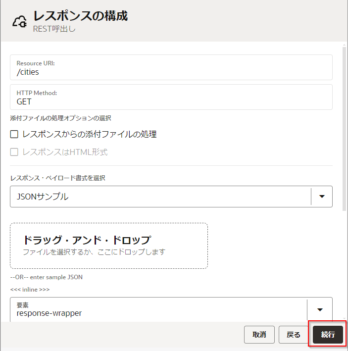 「レスポンスの構成」 ボックスの右上にある 「続行」 ボタンをクリックします。