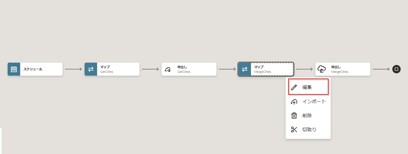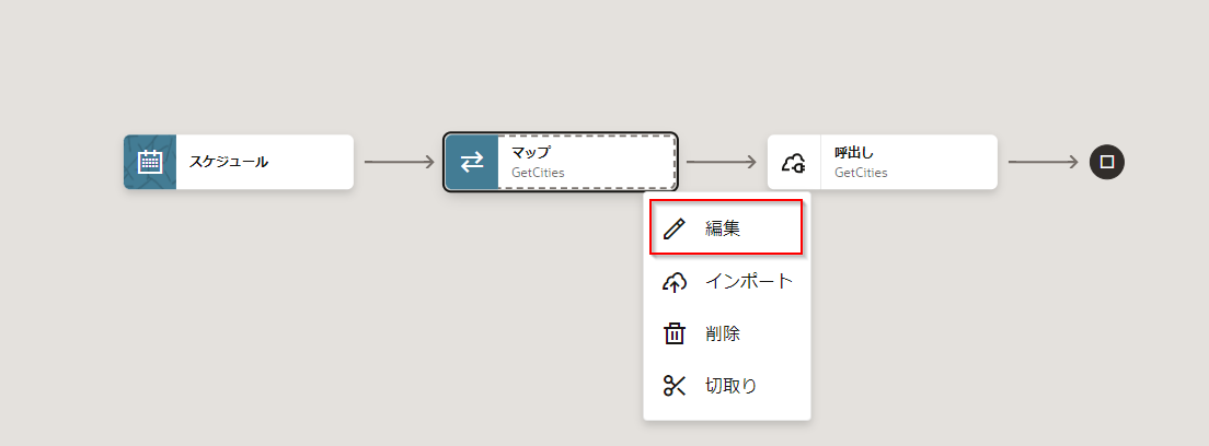 キャンバス・ビューで 「マップ GetCities」 を選択し、「…」から 「編集」 をクリックします。
