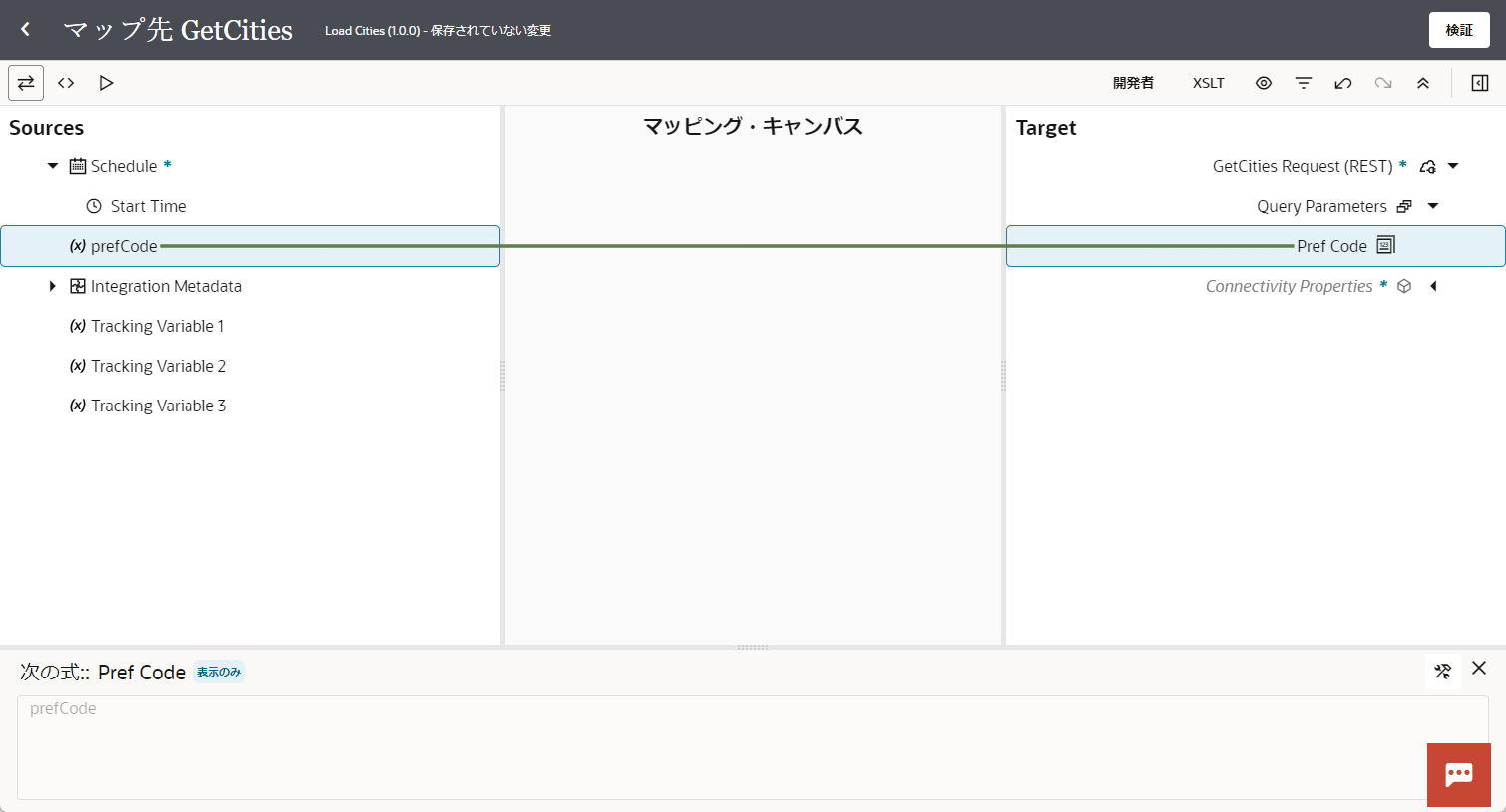 - 「マップ先 GetCities」 は、REST API のリクエストにパラメータを指定する必要がある場合に使用するマッピングです。