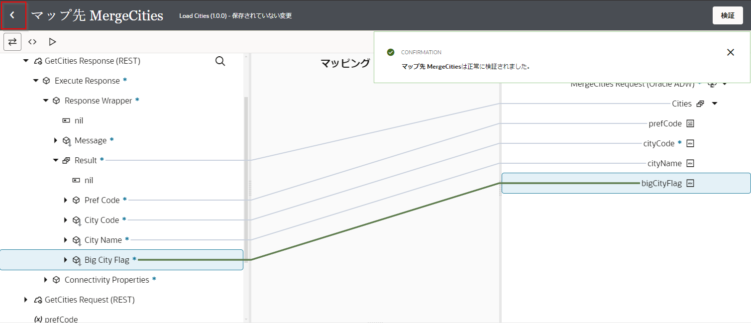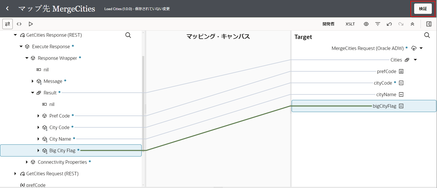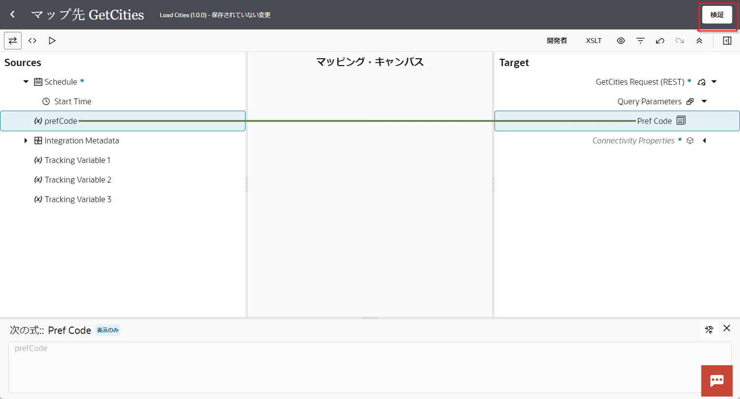 画面右上にある 「検証」 ボタンをクリックして、マッピングが有効かどうかを確認します。