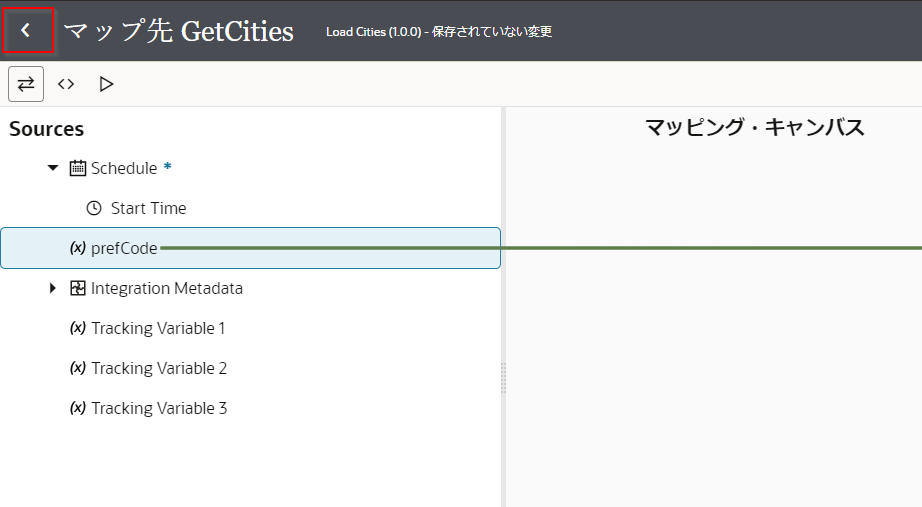 ページの左側に表示される 「Sources」 ツリーに 「prefCode」 が表示されていることを確認します。 この 「prefCode」 は、先ほど設定したスケジュール・パラメータです。
