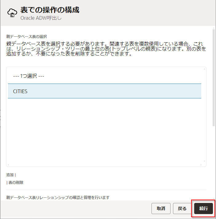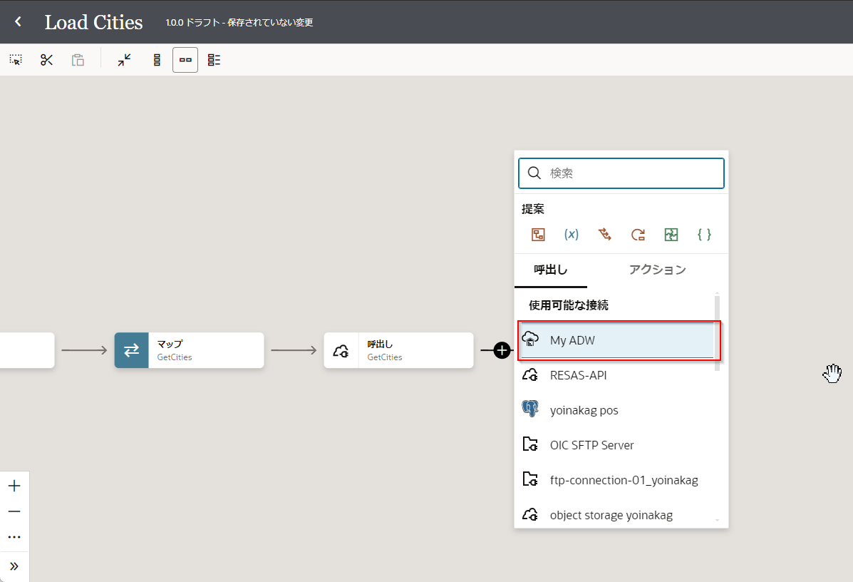 - 「呼出し MergeCities」 は、これまでに設定した Oracle ADW の呼び出しの設定です。