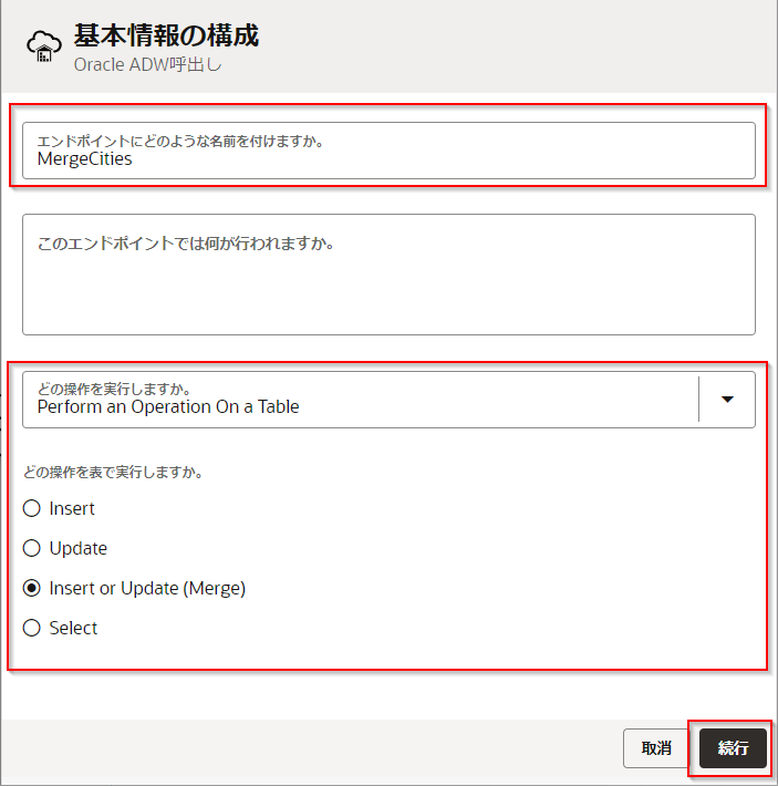 入力し終わったら、 「続行」 ボタンをクリックします。入力項目 入力する値 「エンドポイントにどのような名前をつけますか。」 MergeCities「どの操作を実行しますか。」 「Perform an Operation on a Table」 を選択 「どの操作を表で実行しますか。」 「Insert or Update (Merge)」 を選択