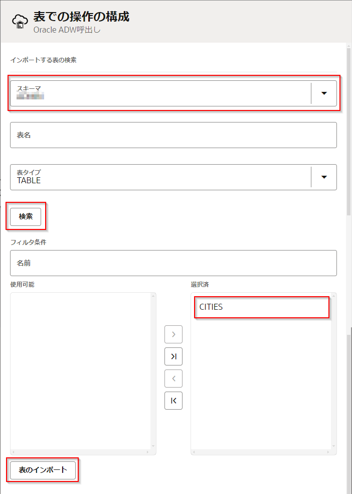 CITIES表のスキーマを選択し、 「表タイプ」 では 「TABLE」 が選択されていることを確認したら、 「表タイプ」 フィールドの下にある 「検索」 ボタンをクリックします。「使用可能」 リストに 「CITIES」 が表示されています。 「CITIES」 を選択した状態で、 「>」 ボタンをクリックします。 「CITIES」 が、 「選択済み」 リストに移動したことを確認したら、 「表のインポート」 ボタンをクリックします。