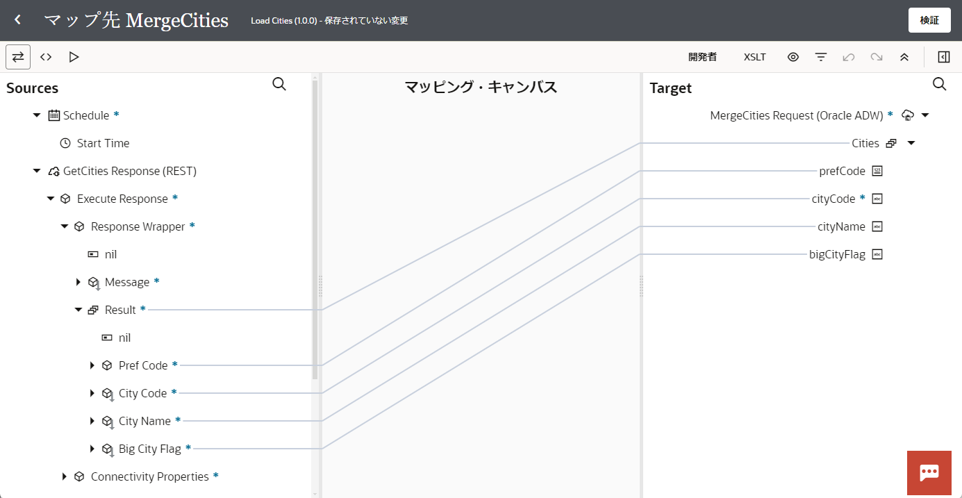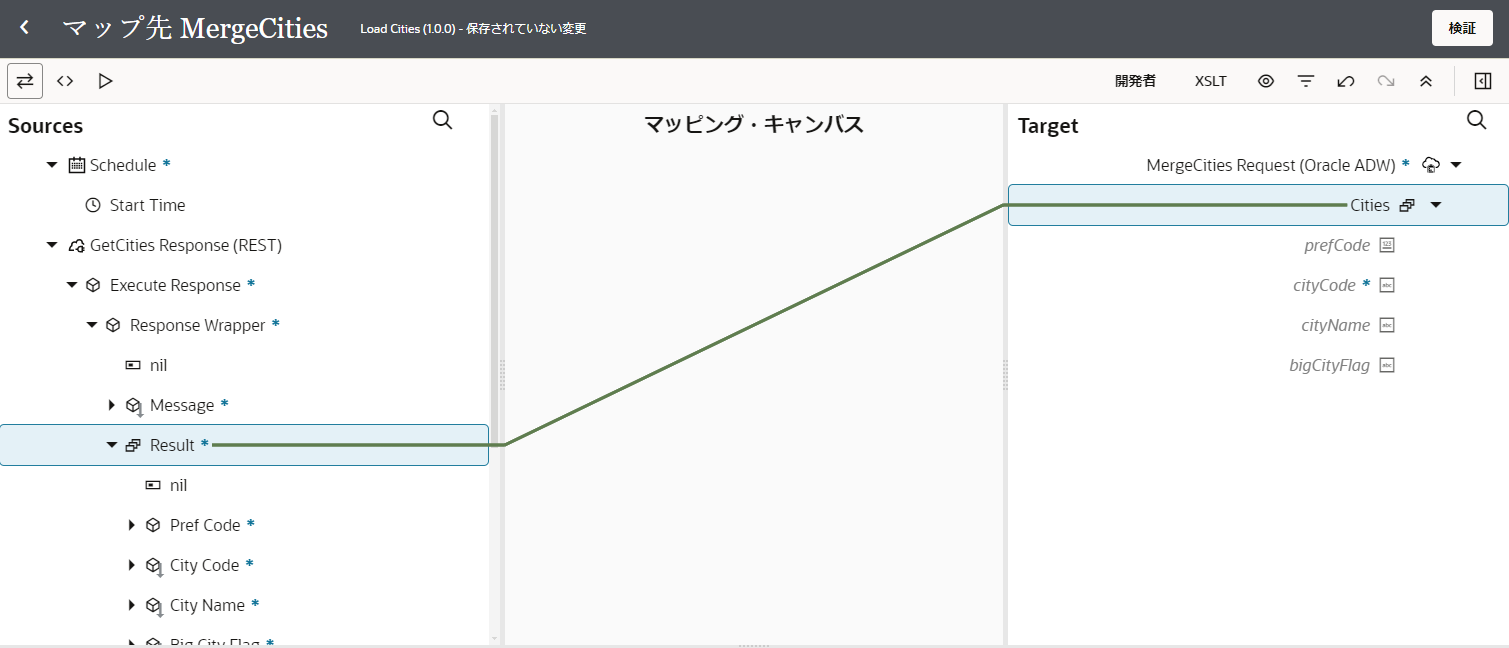 データのマッピングの設定を行うためのマッパーが表示されます。 マッパーの画面左側に表示されている 「Sources」 ペインの 「GetCities Response (REST)」 → 「Execute Response」 → 「Response Wrapper」 → 「Result」 を、画面右側に表示されている 「Target」 ペインの 「MergeCities Request (Oracle ADW)」 → 「Cities」 にドラッグ&ドロップします。