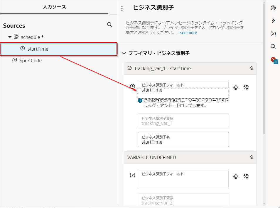「ビジネス識別子」 ボックスが表示されます。 ボックス左側のツリーから 「schedule」 の下の 「startTime」 を、ボックスの右側に表示されているテーブルの 「プライマリ・ビジネス識別子」 の1行目にドラッグ&ドロップします。